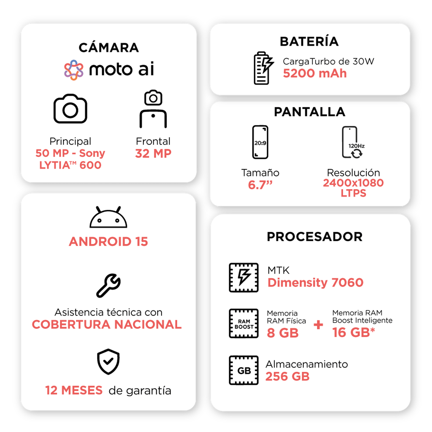 – Pantalla FHD+ de 6.7″ con tasa de refresco de 120 Hz y Gorilla Glass 7i que brinda imágenes brillantes y protección reforzada contra rayones.